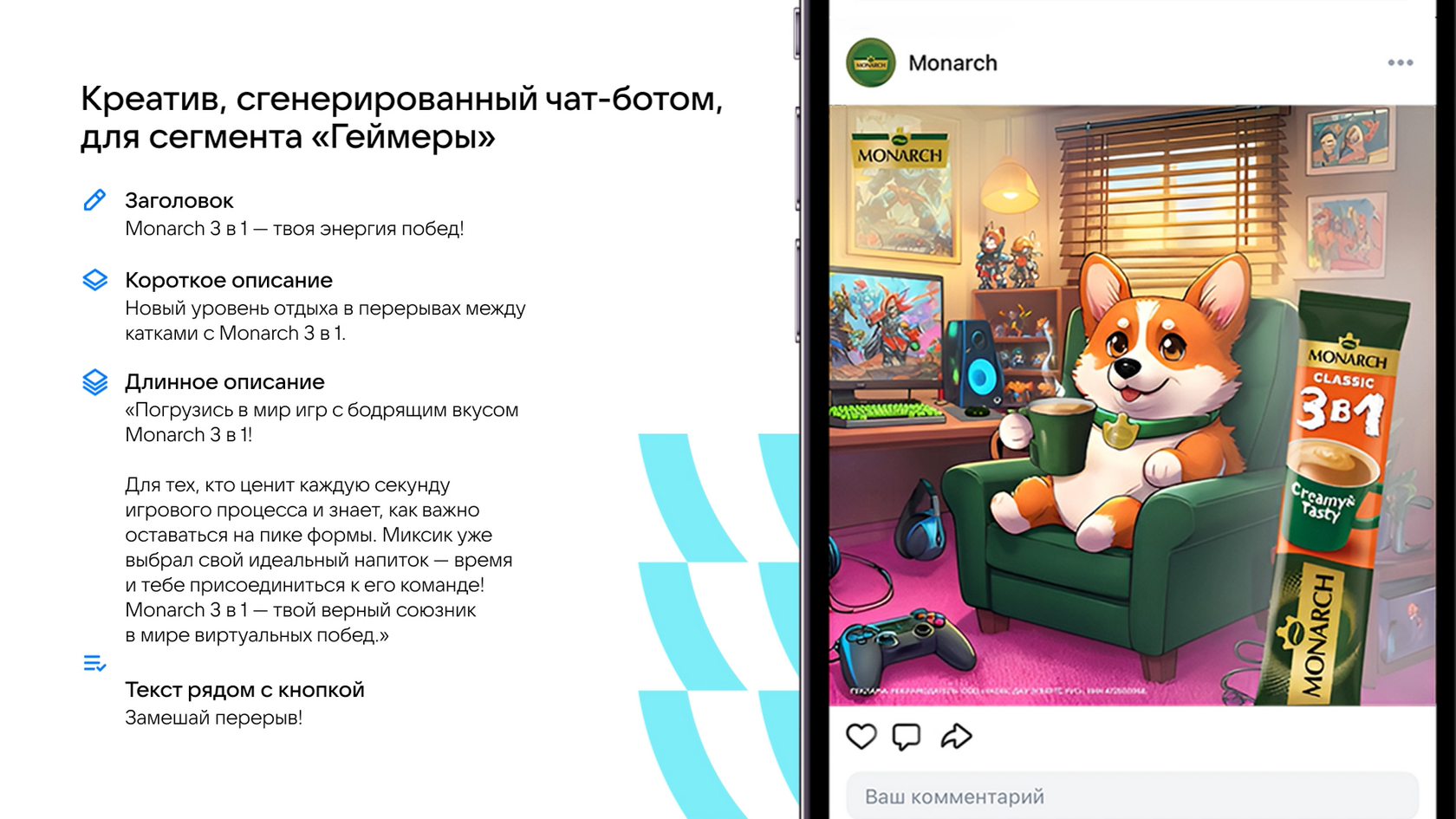Подготовка к кампании и её проведение состояли из четырех этапов. На первом с помощью маркетинговой платформы VK CXhub собрали данные об аудитории бренда Monarch из различных каналов: рекламных кабинетов, веб-сайтов, мобильных приложений и социальных сетей. На втором этапе полученные данные легли в основу расширенного профилирования аудитории, которое команда VK Predict провела с помощью алгоритмов машинного обучения. Это позволило выделить три ключевых сегмента аудитории: студенты, молодые офисные работники, геймеры. Третьим этапом стало создание чат-бота с заложенным в него генеративным ИИ с RAG-подходом (примечание: подход Retrieval-Augmented Generation сочетает генерацию креативов с извлечением релевантной информации из дополнительных источников данных для повышения точности и информативности создаваемого контента):