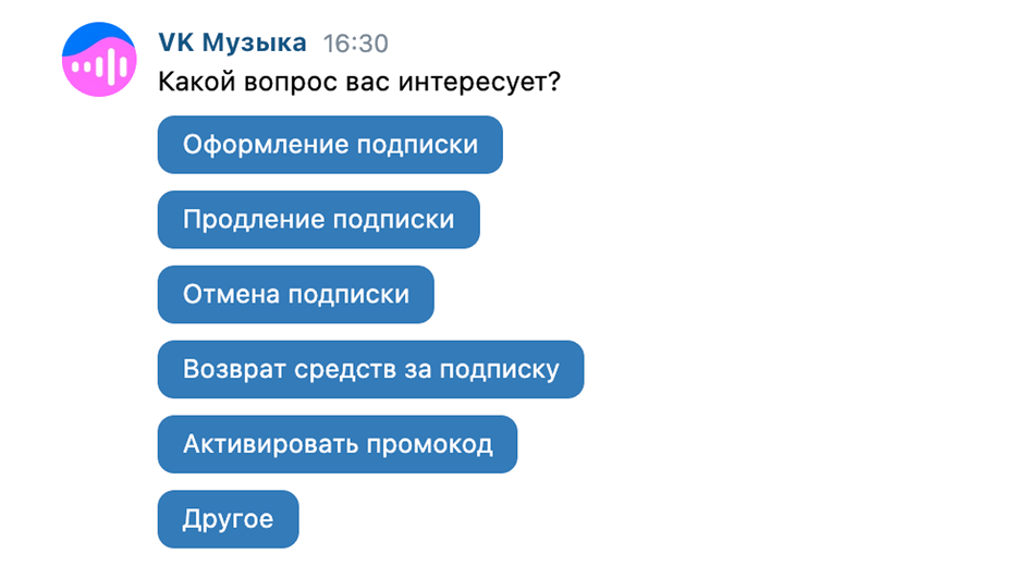 С помощью VK CXhub мы вывели поддержку пользователей на новый уровень, внедрив в сообщество VK Музыки ВКонтакте чат-бота. Сначала он учитывал самые распространенные сценарии, состоящие из двух — четырех шагов.