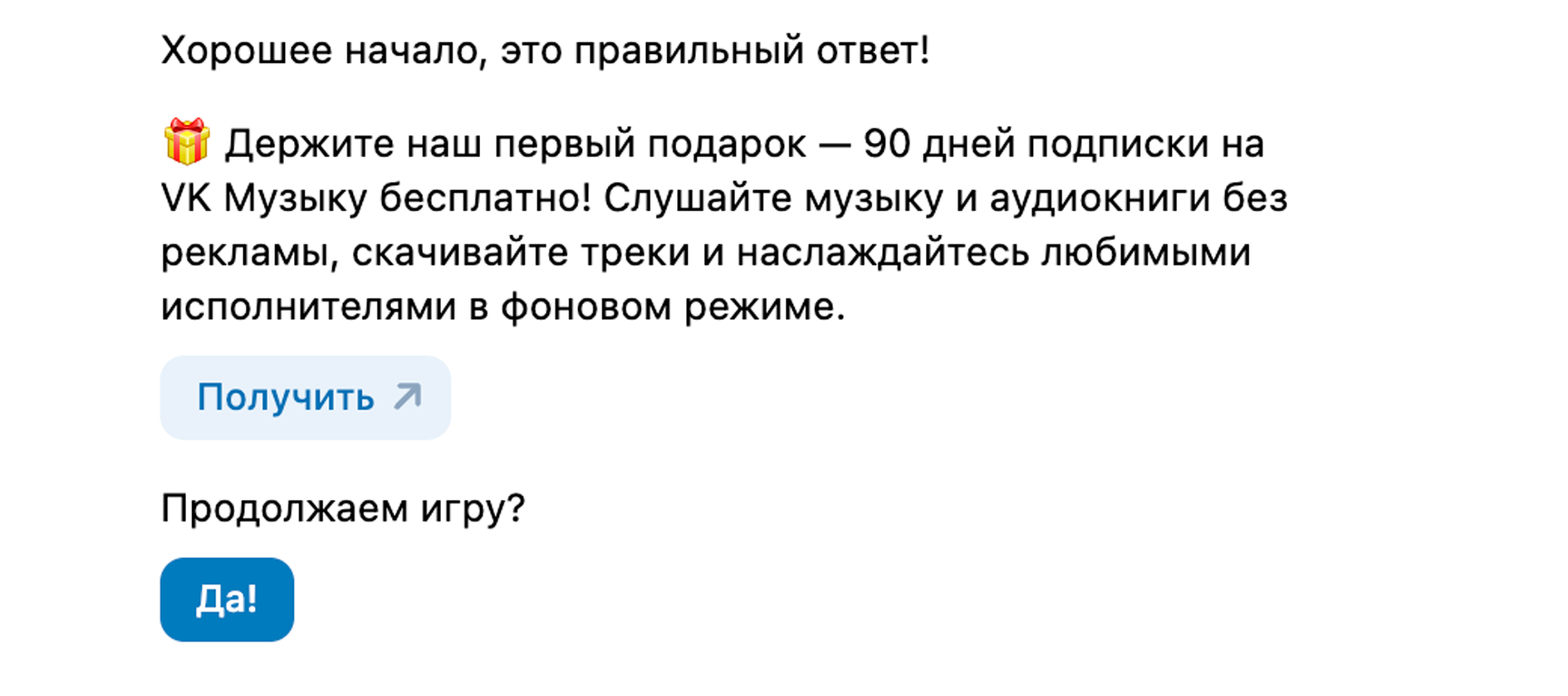 - после правильного ответа на первый вопрос пользователь, у которого не было подписки на VK Музыку, получал предложение оформить ее на 90 дней бесплатно;