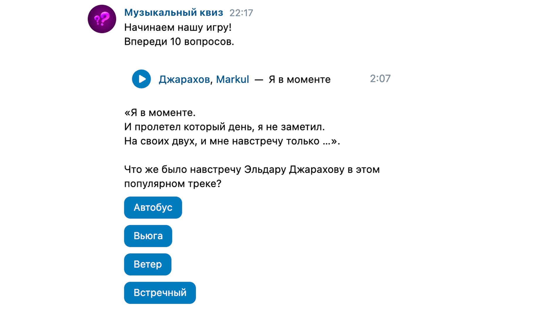Чтобы запустить эту функциональность, в VK CXhub мы создали чат-бота, который отправлял пользователям трек, текстовый фрагмент из него с пропущенным словом и предлагал выбрать из нескольких вариантов ответов правильный, чтобы заполнить пропуск: